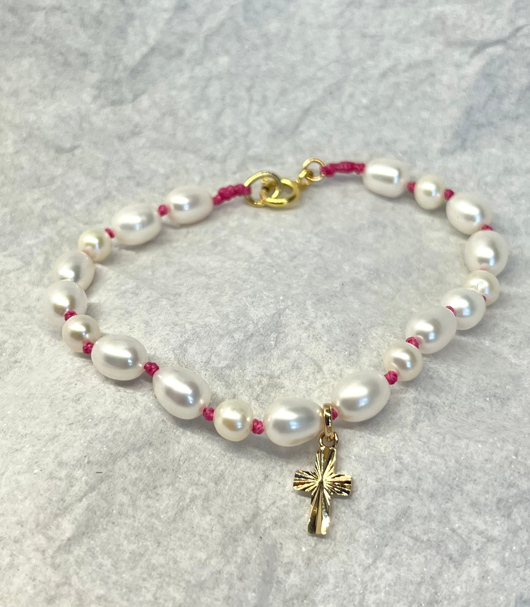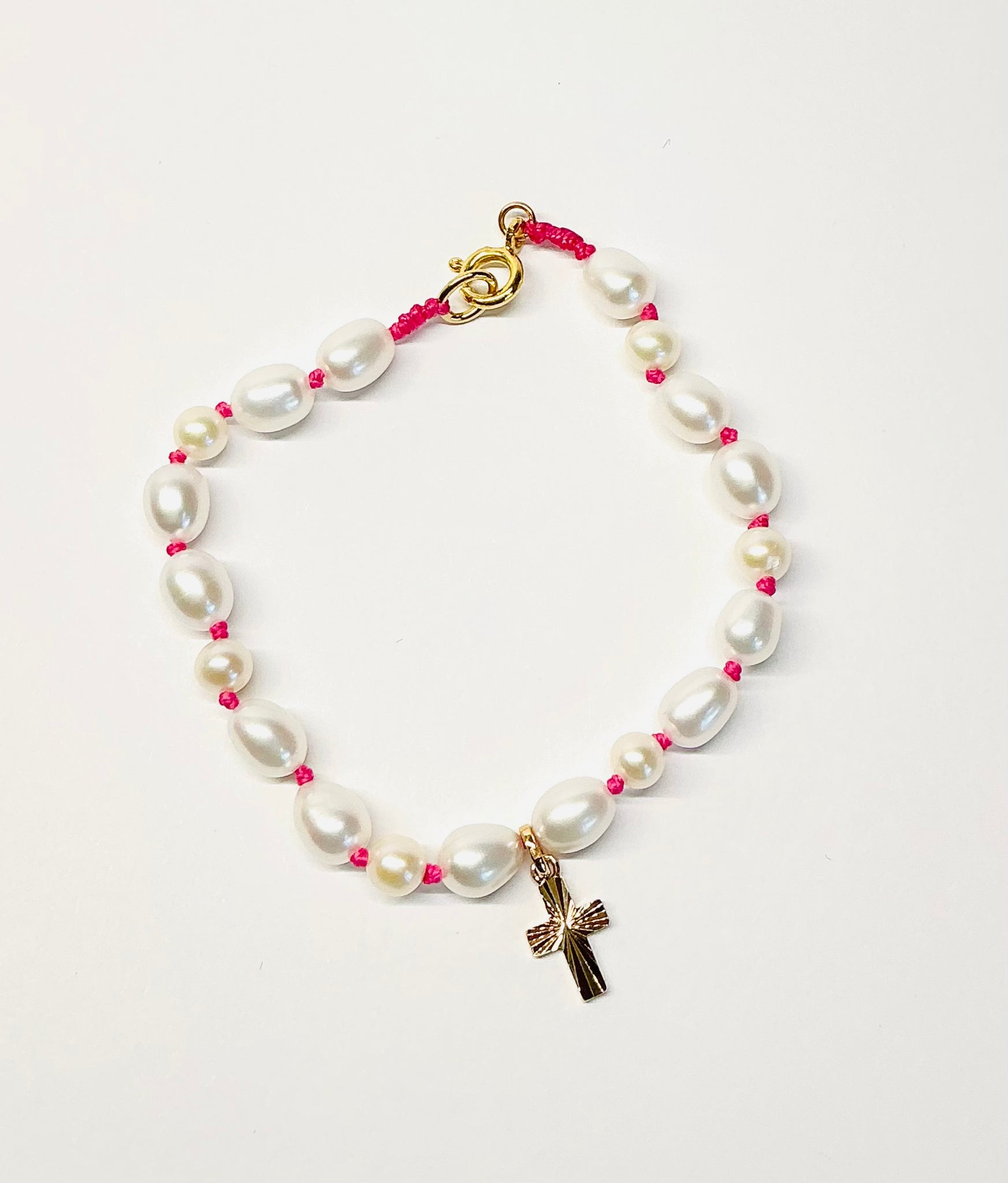 Un bracelet réalisé avec un mélange de deux formes de perles de cultures associées à une petite croix merveilleuse.