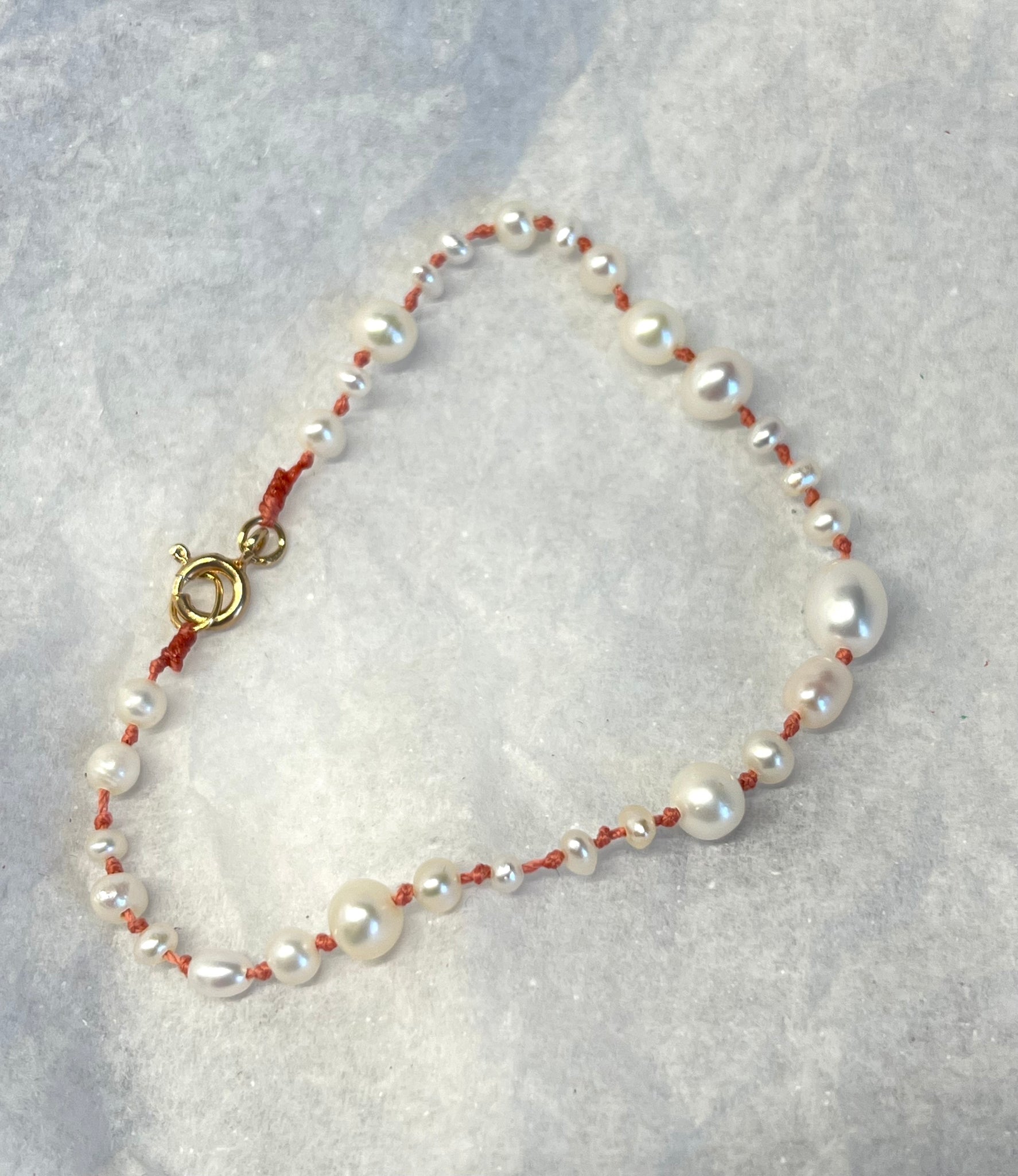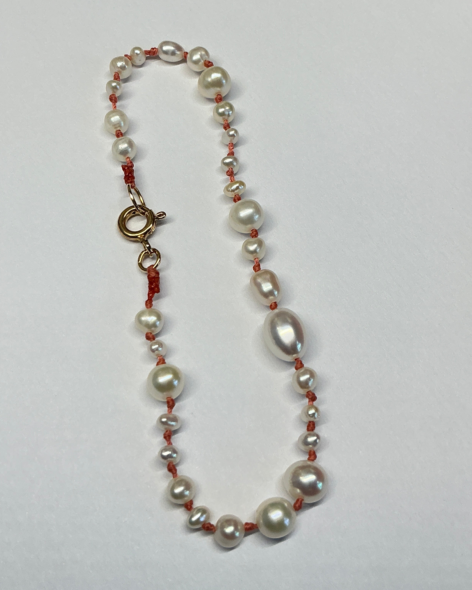 Un bracelet réalisé avec plusieurs taille et formes de perles de culture.