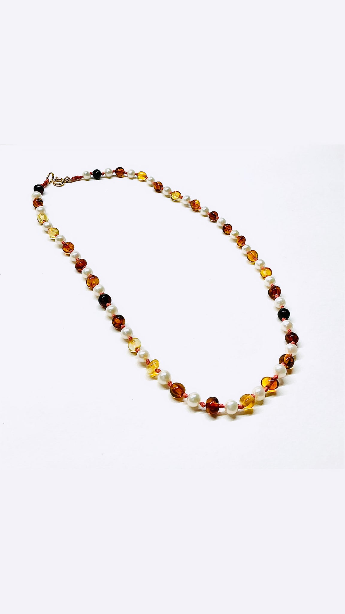 Collier en Ambre baltique et perles de culture d’eau douce blanches sur fil bois de rose.